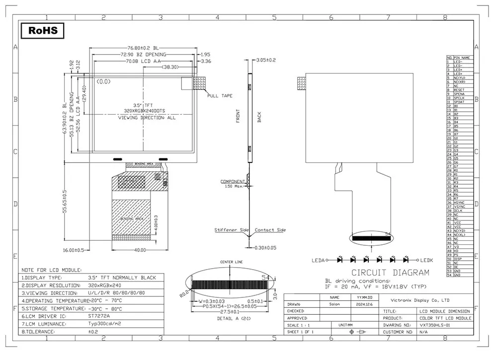 TFT LCD, görüntü kalitesini artırmak için ince film transistör teknolojisini kullanan bir tür sıvı kristal ekrandır ve günlük yaşamda çok sayıda uygulamaya sahiptir. Çin'de profesyonel bir TFT modülü üreticisi ve tedarikçi olarak, Victronix 3.5 inç 320 × 240 QVGA IPS TFT modülünü diğer üreticilerden farklı kılan nedir? Birincisi, 300 CD/m²'lik tipik bir parlaklık, her yöne 80 ° geniş görüntüleme açıları ve 800: 1 kontrast oranı sunar ve çeşitli açılardan mükemmel okunabilirlik sağlar. İkincisi, 6S beyaz LED'leri kullanarak tipik bir ömürle 30.000 ila 50.000 saat (% 50 başlangıç parlaklığına) entegre ederek tüm aydınlatma koşullarında net bir görünürlük sağlar. Ayrıca, ST7272A denetleyicisi ile bir RGB 24 bit arayüzü destekler. Ek olarak, termal şok (-30 ° C ↔ +80 ° C döngüler), nem depolama (60 ° C/% 90 RH) ve mekanik titreşim dahil olmak üzere titiz çevresel testleri ve uzatılmış bir sıcaklık aralığında (-20 ° C ila +70 ° C) sorunsuz bir şekilde çalışabilmesini sağlar.