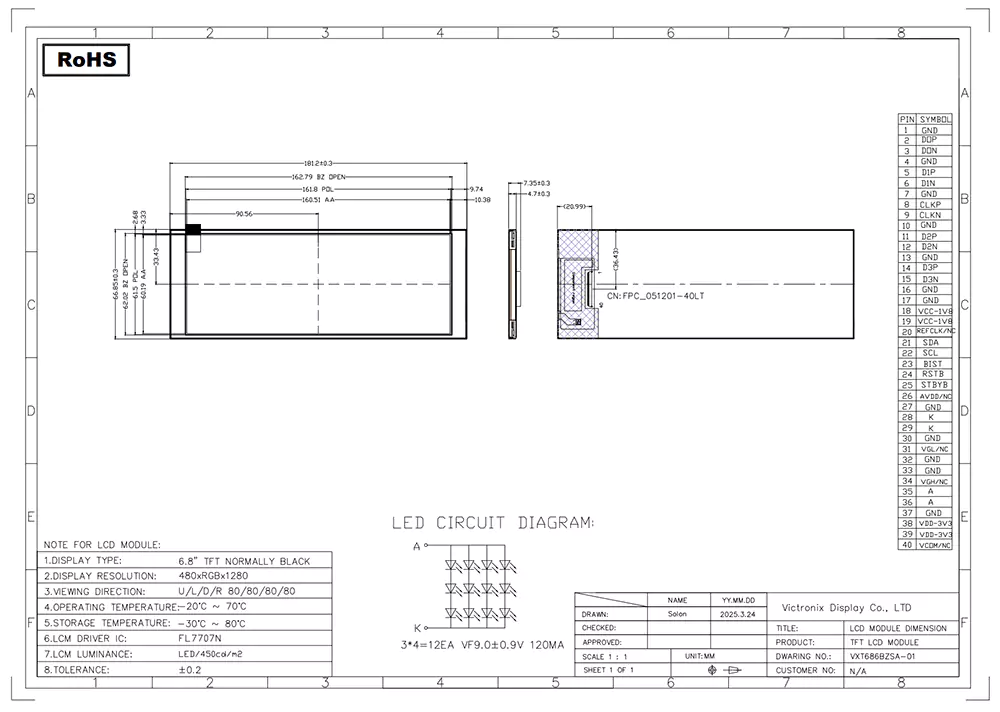 TFT LCD, görüntü kalitesini artırmak için ince film transistör teknolojisini kullanan bir tür sıvı kristal ekrandır ve günlük yaşamda çok sayıda uygulamaya sahiptir. Çin'de profesyonel bir TFT modülü üreticisi ve tedarikçi olarak, Victronix 6.86 inç 480 × 1280 IPS TFT modülünü diğer üreticilerden farklı kılan nedir? İlk başta, 450CD/m²'lik tipik bir parlaklık, 16.7m renkler, her yönde 80 ° (tipik) geniş bir görüntüleme açısı ve 800: 1 kontrast oranı sunar ve çeşitli açılardan mükemmel okunabilirlik sağlar. İkincisi, tipik bir ömre 30.000 ila 50.000 saat (% 50 başlangıç parlaklığına) sahip 3 × 4 beyaz LED kullanan bir arka ışık ünitesini entegre ederek tüm aydınlatma koşullarında net görünürlük sağlar. Ayrıca, yüksek hızlı veri aktarımı ve basitleştirilmiş entegrasyon için 4 şeritli MIPI DSI arayüzü kullanır. Ek olarak, yüksek/düşük sıcaklıkta depolama ve çalışma, sıcaklık döngüsü, nemli ısı (nem) testi dahil olmak üzere titiz çevresel testleri geçirir, böylece -20 ° C ila +70 ° C arasında uzatılmış bir sıcaklık aralığında sorunsuz bir şekilde çalışabilir.